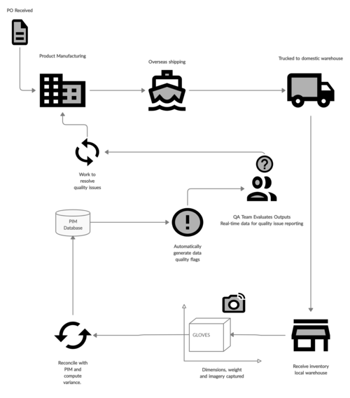 Torq IT developed an innovative 2-way sizer platform using Pimcore as the backbone of the process. After arriving at the distribution partner, the product shipment is unloaded and carted to the QA area where the barcode on the product case is read and validated by the QA system. The operator then places the product case on a parcel sizer and takes a webcam photo of the product, measures its dimensions, and weighs it. Each scan coincides with a barcode reader scan and is used for barcode validation as well as operator ease of use. The scanning process is quick and operators can scan 100-200 items per hour. Each barcode scan is stored as a unique record by SKU/case size in the PIM system. Historical data for a given SKU can be viewed to show each time the SKU was scanned and data points across scans can then be compared to determine any variance between the new scan and the historical scans. For example, imagery from each scan session is stored and can be used to diagnose any box art issues. If there are variances, the QA operator can create a QA ticket or take another action based on the results.